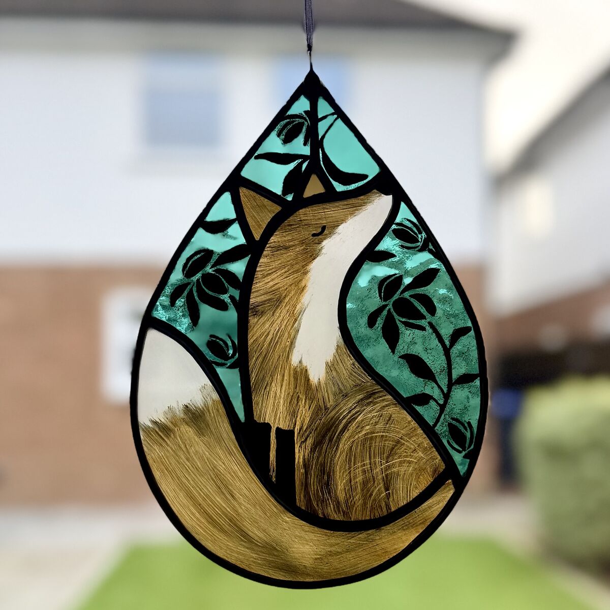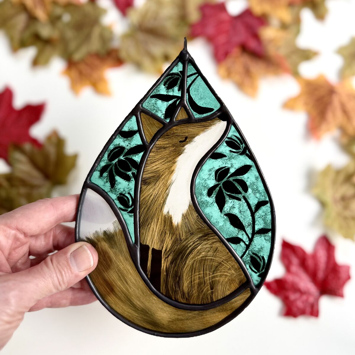 A hand painted fox stained glass hanging.
