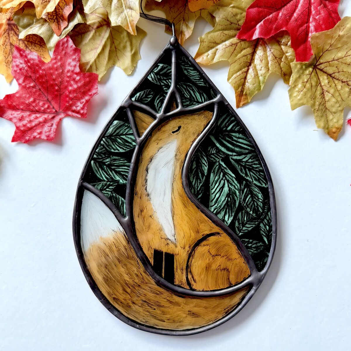 A hand painted fox stained glass hanging.