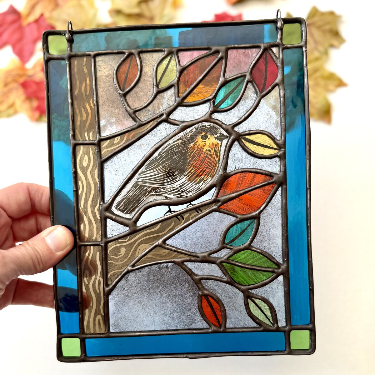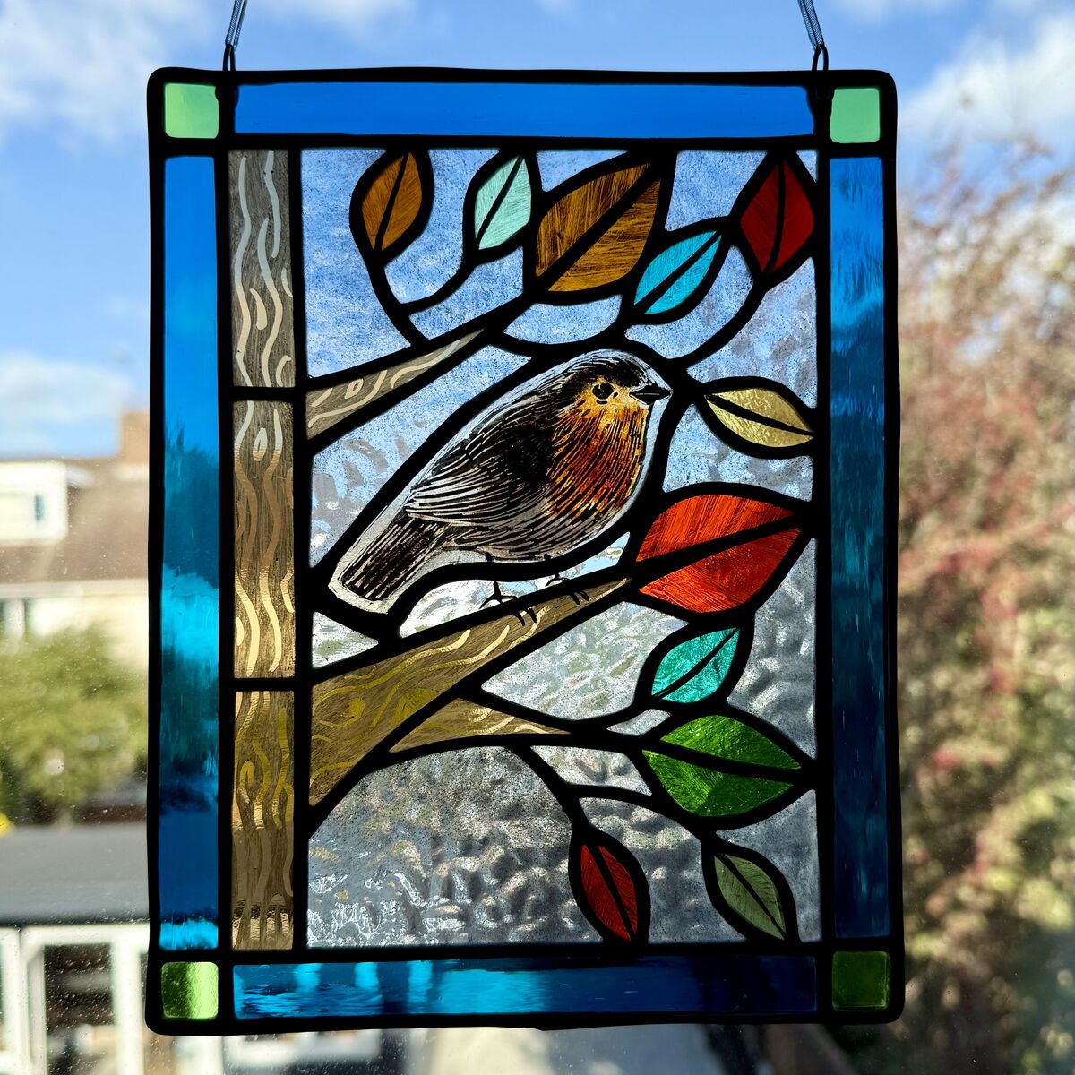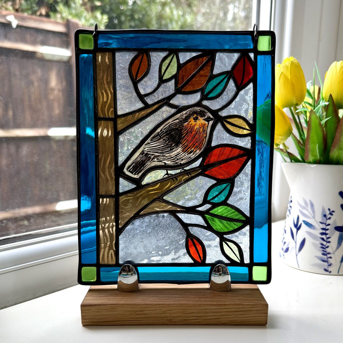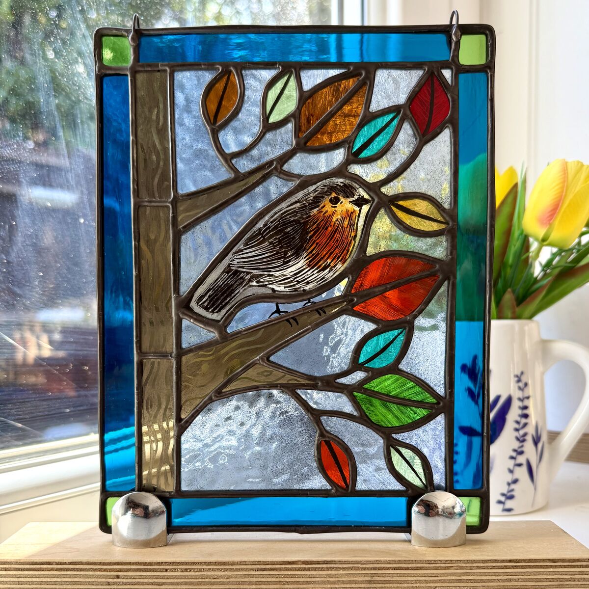 Each piece of glass has been hand cut and the design painted on in layers. The colours for the robin have been created using glass powder which has been fused to the glass before the painted details were added. Each layer of paint has been fixed permanently by firing in my kiln to a temperature of around 670 degrees Celsius in order to permanently fix in place.