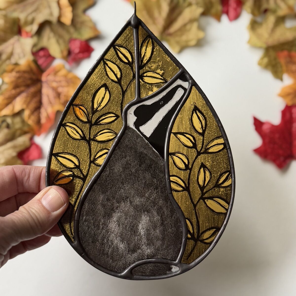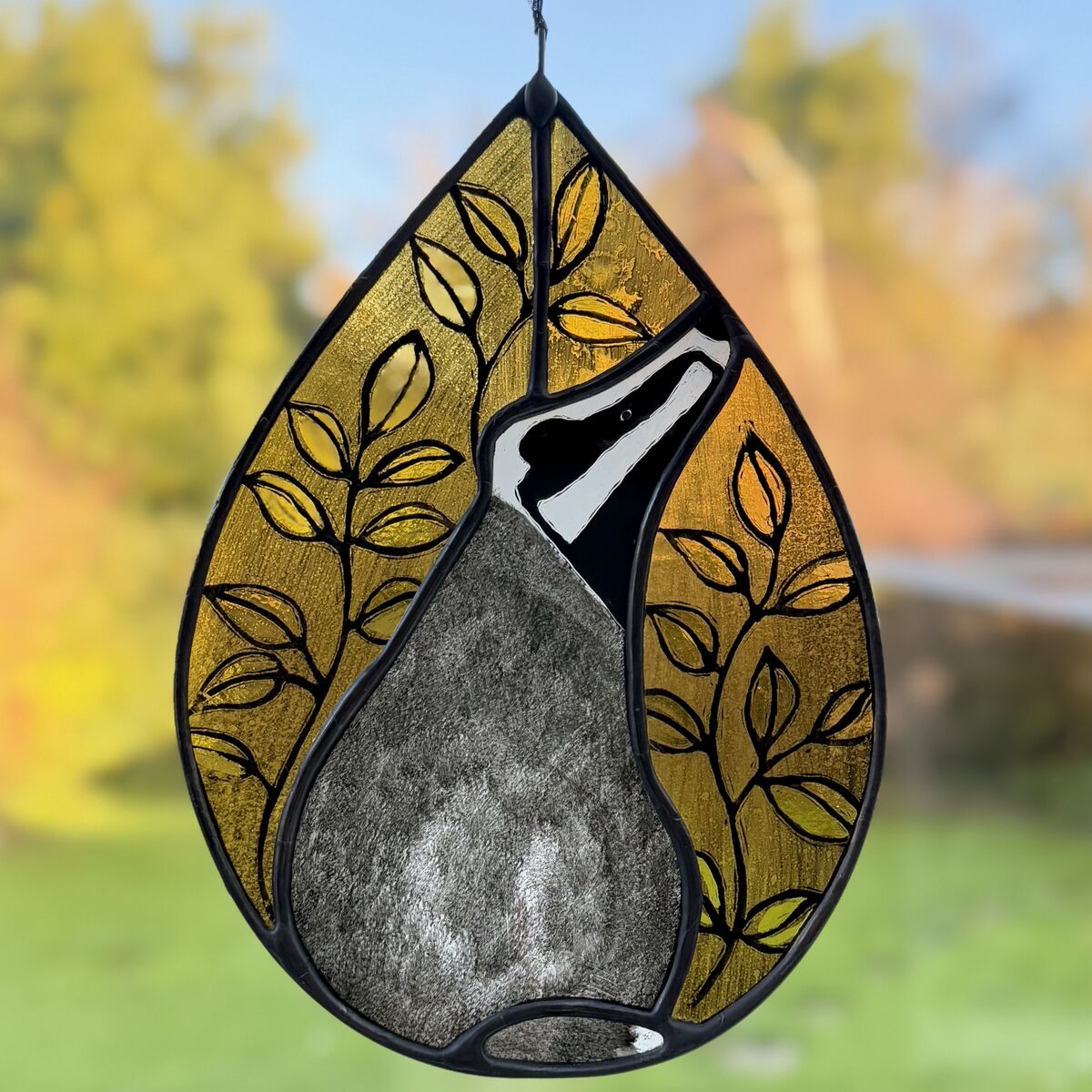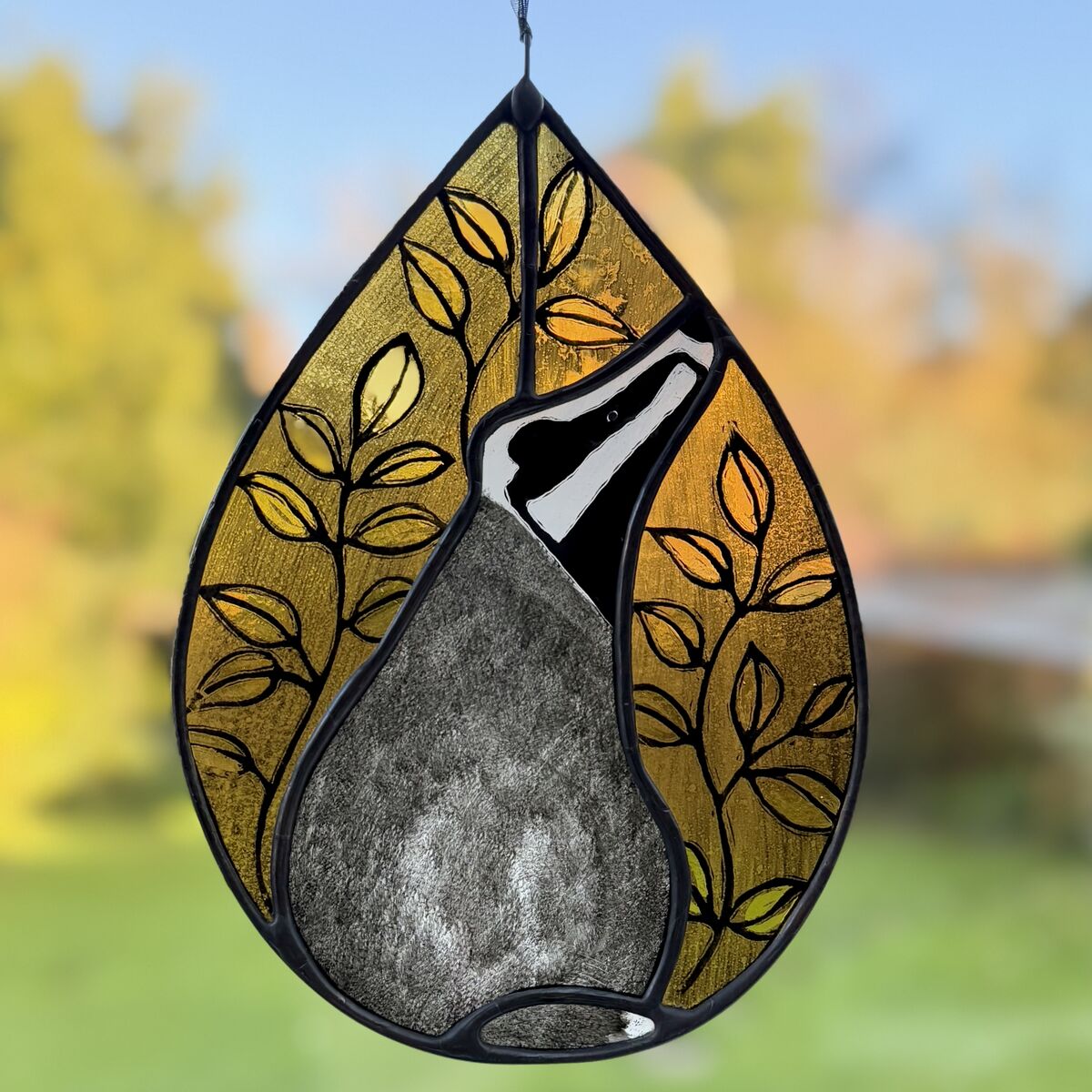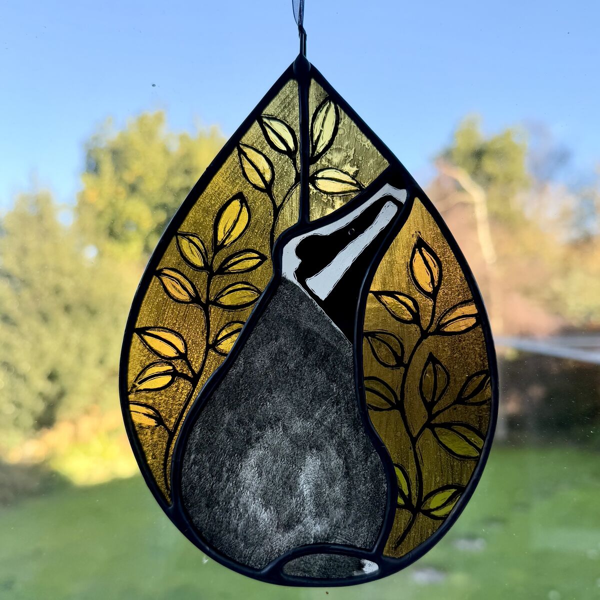 The badger and the surrounding glass have been painted using layers of enamel paint. Each layer is fired separately in order to permanently fix it in place.