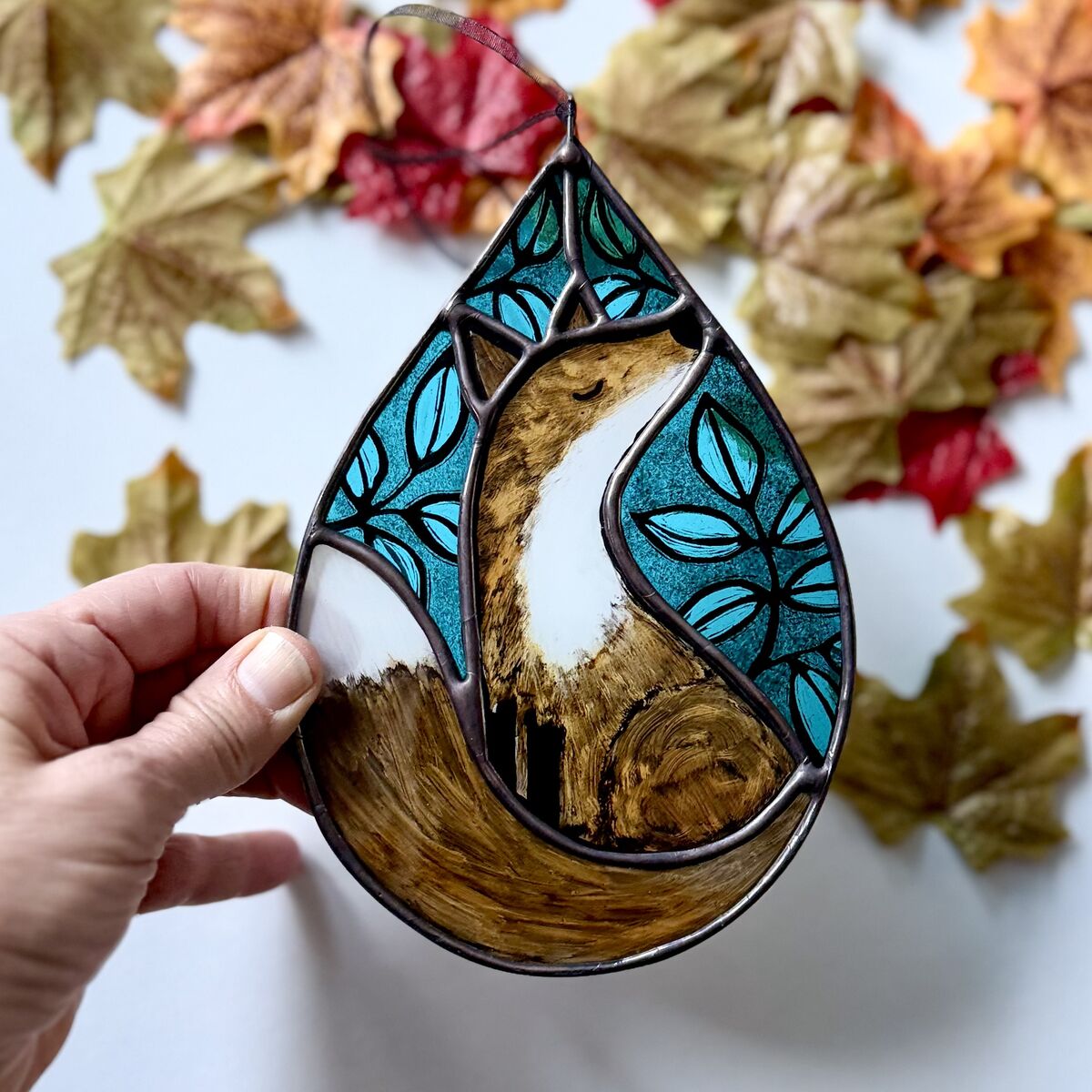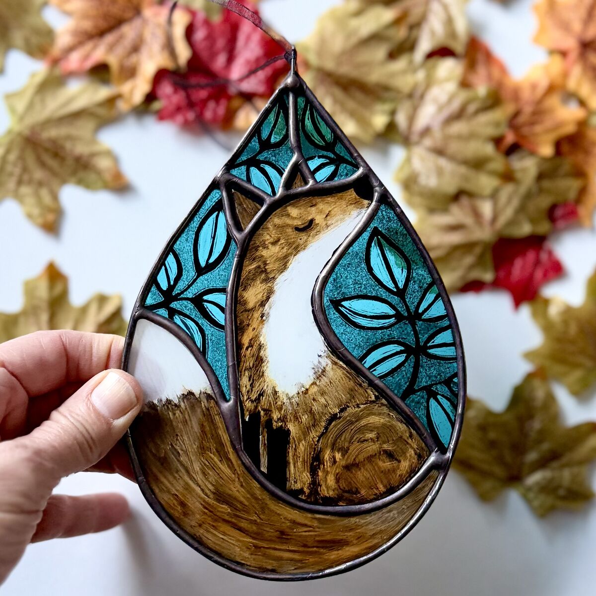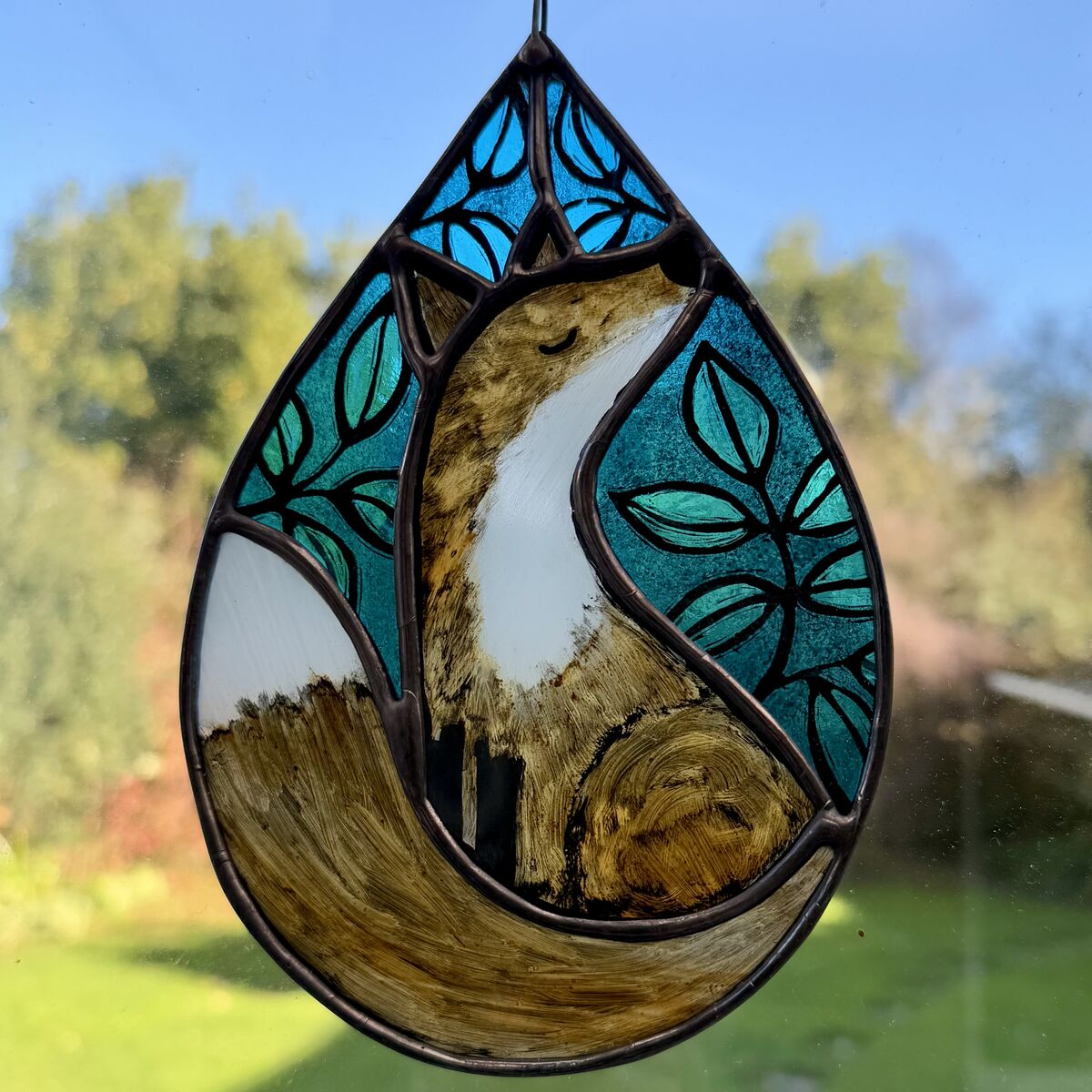 The fox and the surrounding glass have been painted using layers of enamel paint. Each layer is fired separately in order to permanently fix it in place.
