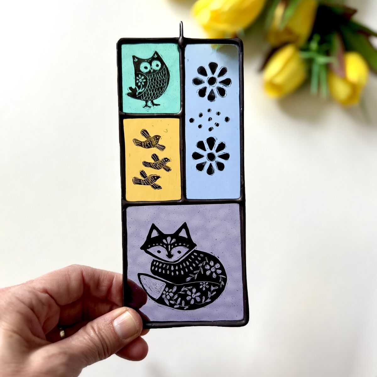 Brighten up your window with this hand painted hanging featuring a folk style fox, owl and birds.