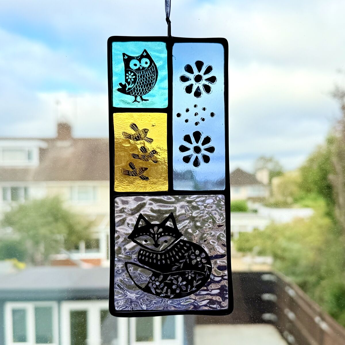 Once cooled each piece of glass is edged with copper foil tape and soldered together. The hanging has been edged in lead came for extra strength and comes with a ribbon for hanging.