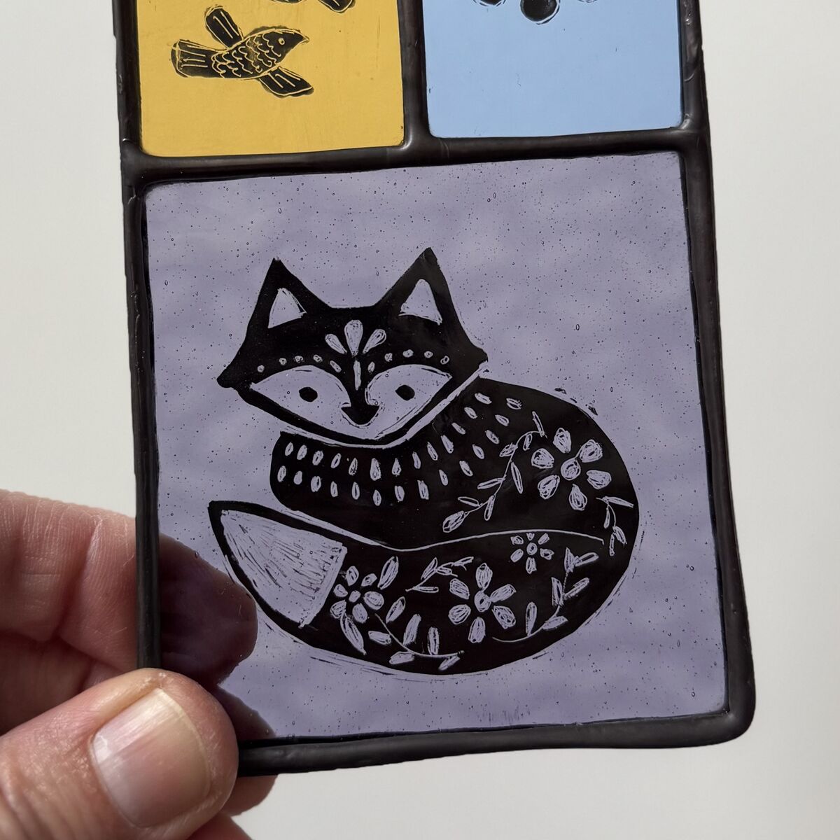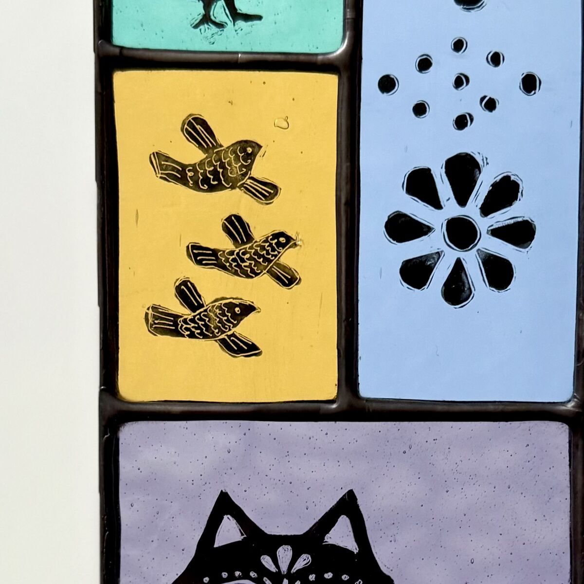 Each piece of glass has been hand cut and painted using enamel paint which is fired in my kiln to a temperature of around 670 degrees Celsius in order to permanently fix in place.