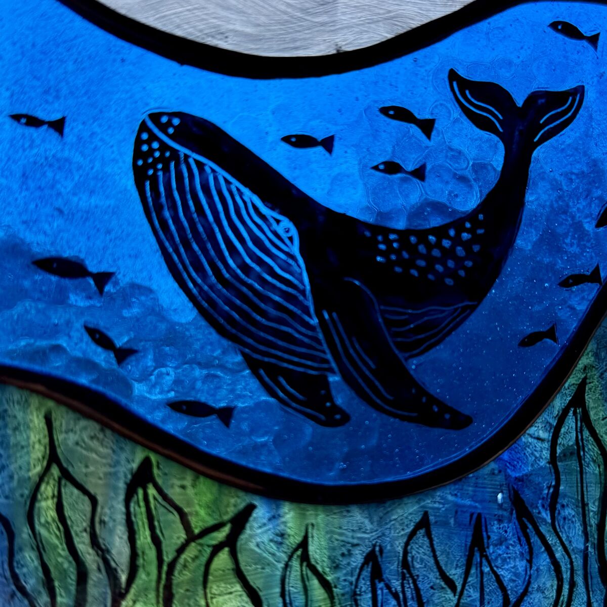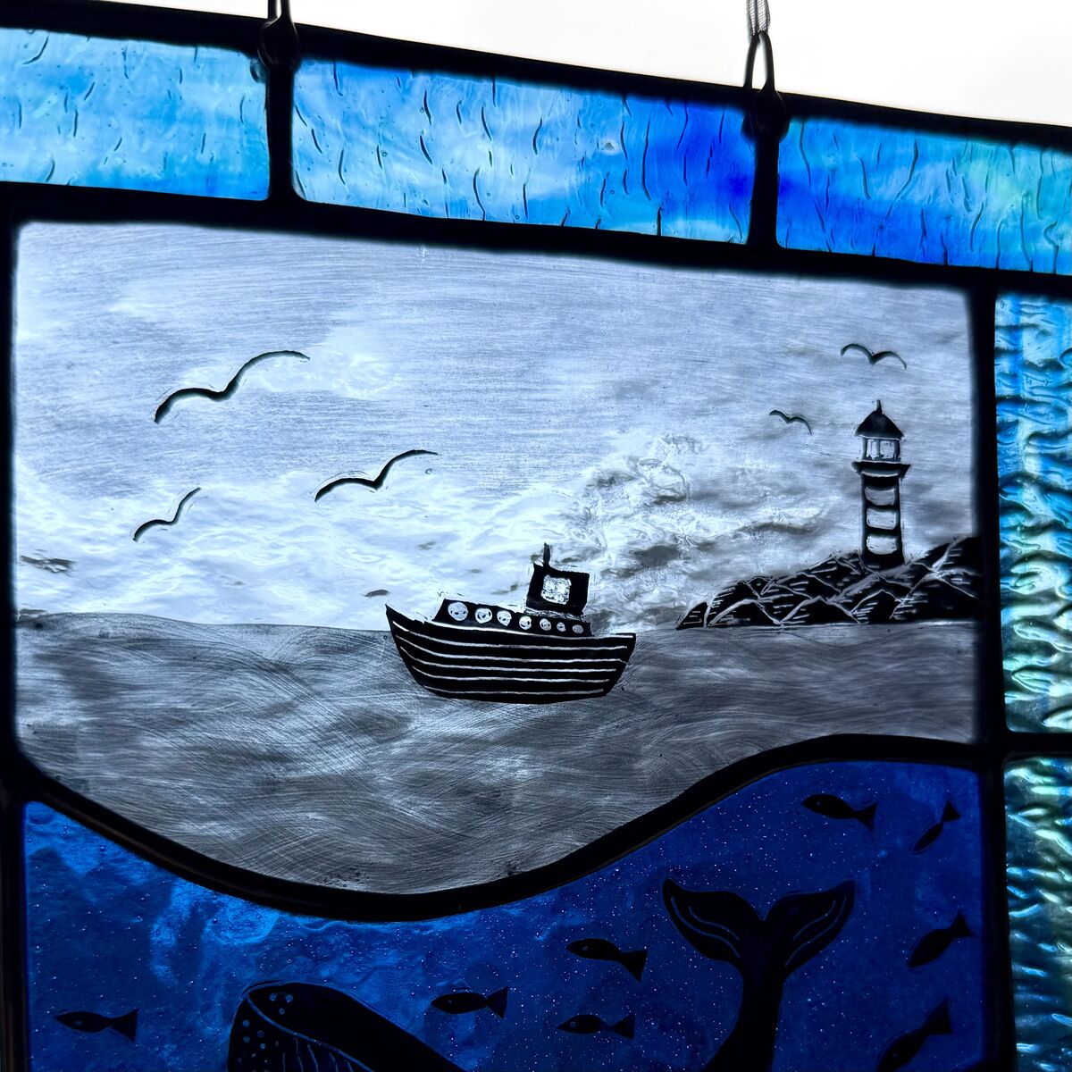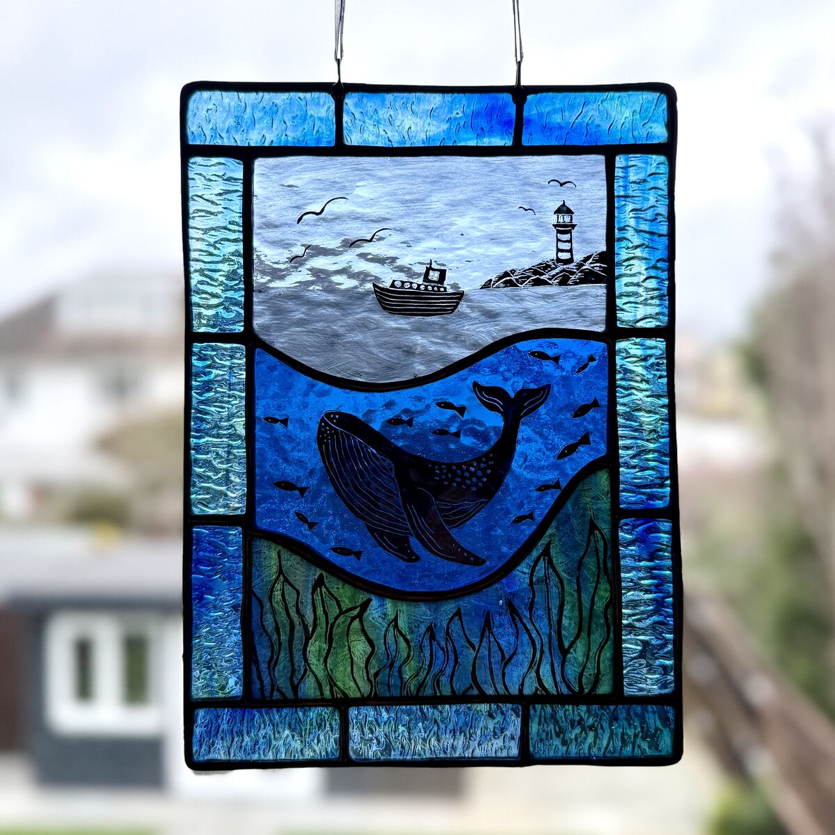 Brighten up your window with this hand painted ocean scene featuring a whale and a lighthouse.