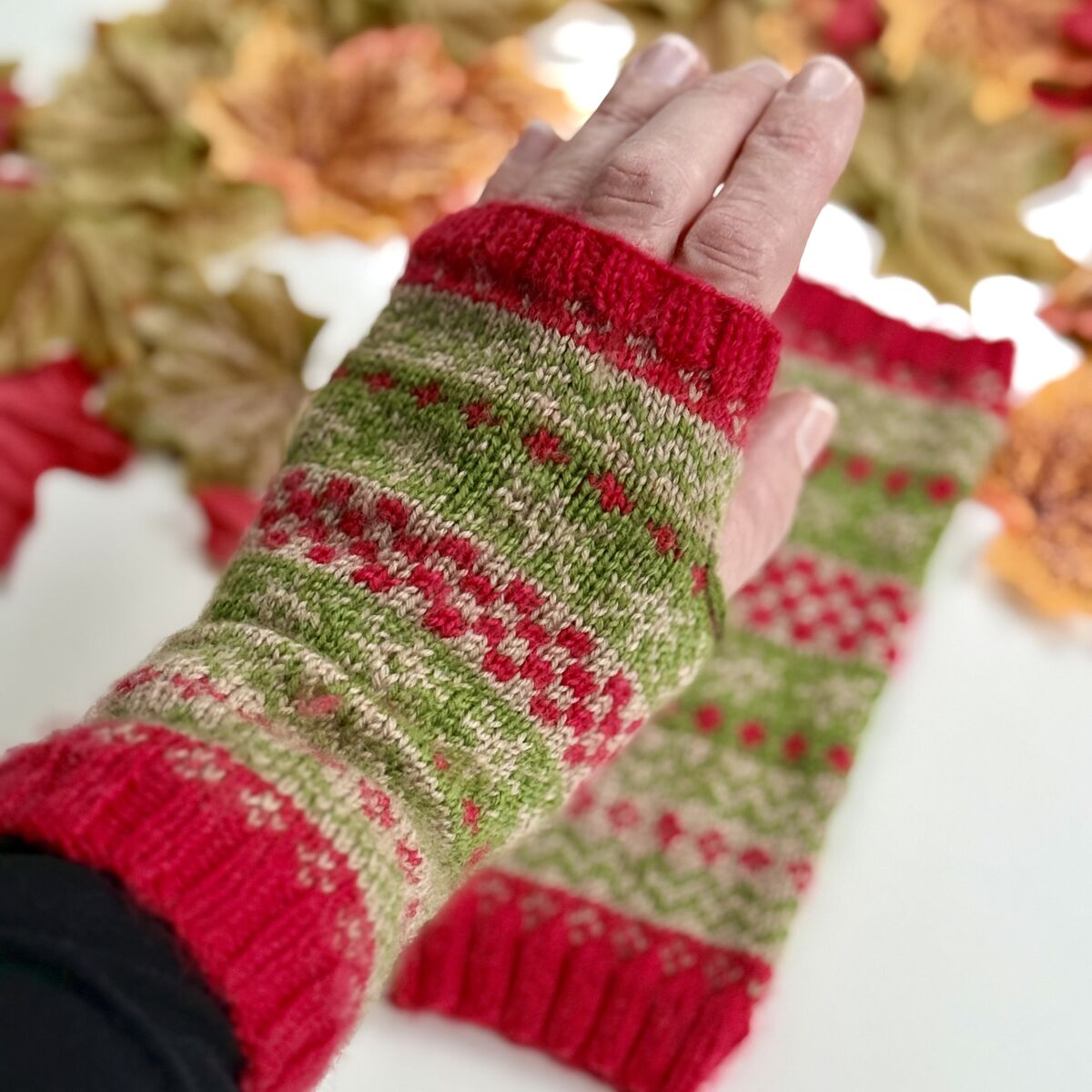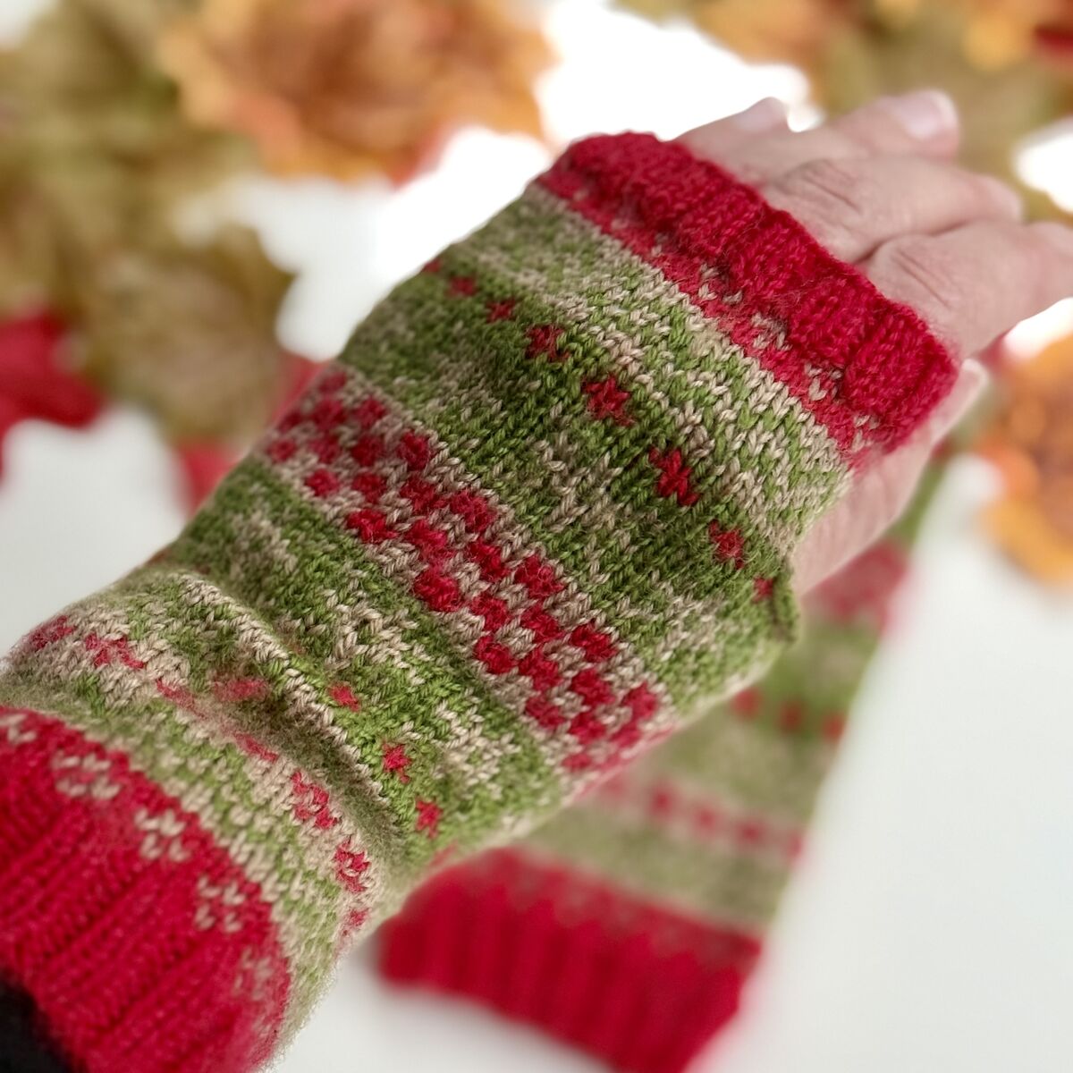 Hand Knitted Wrist Warmers Red, Green Fairisle