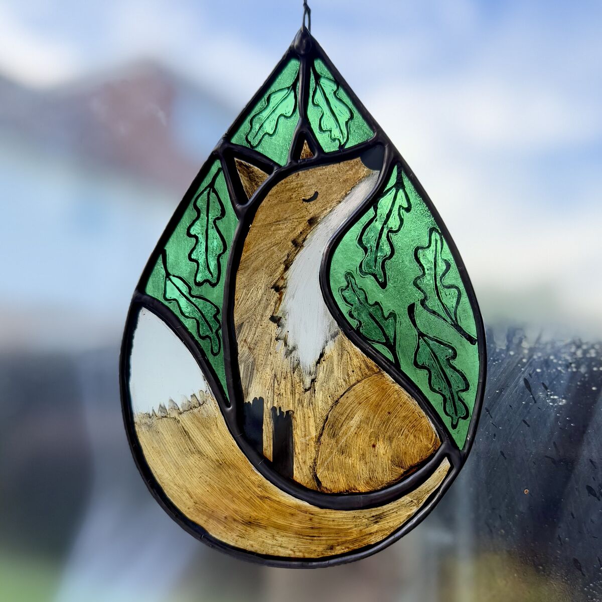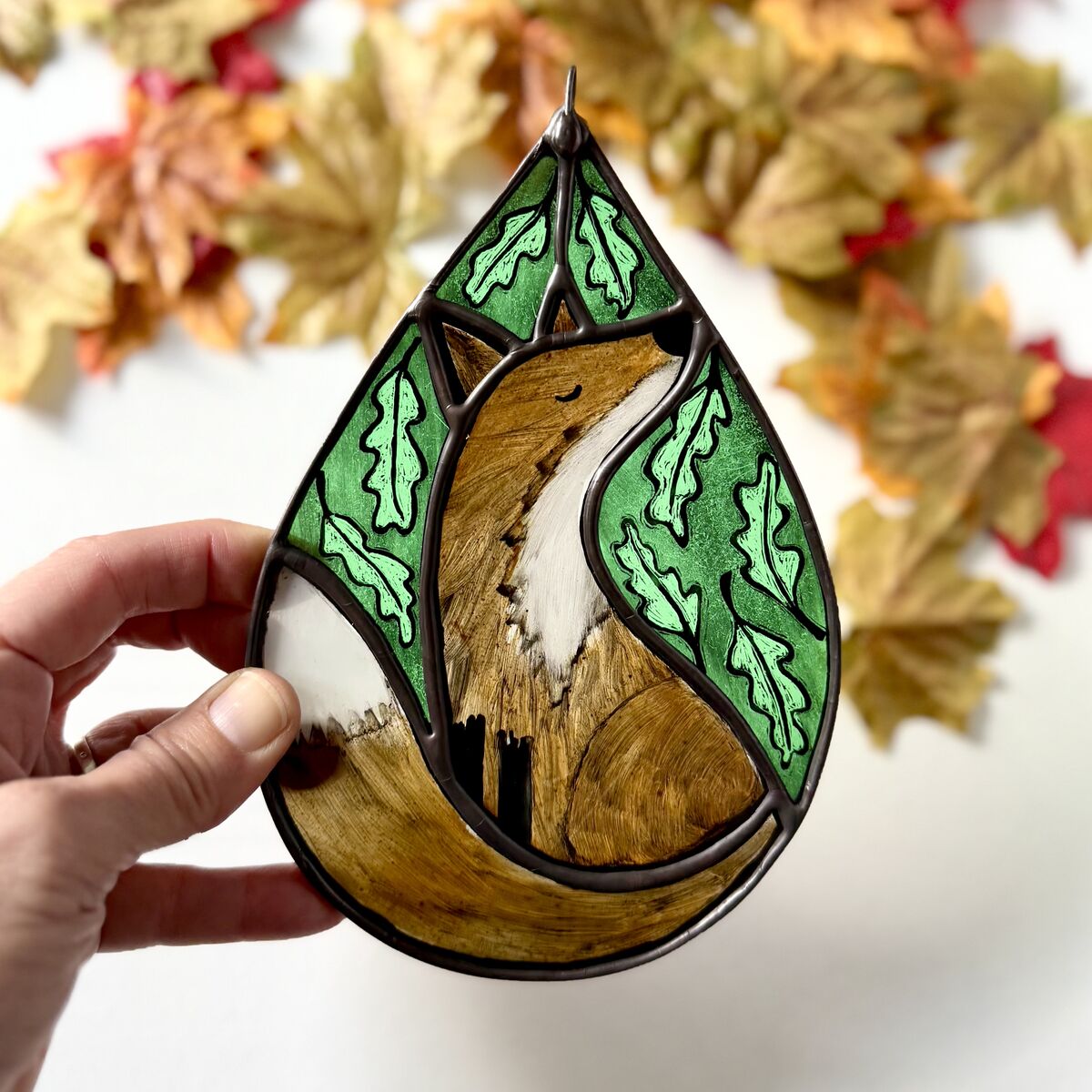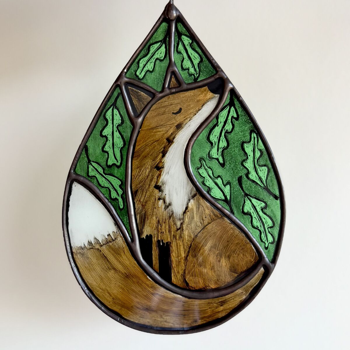The fox and the surrounding glass have been painted using layers of enamel paint. Each layer is fired separately in order to permanently fix it in place.