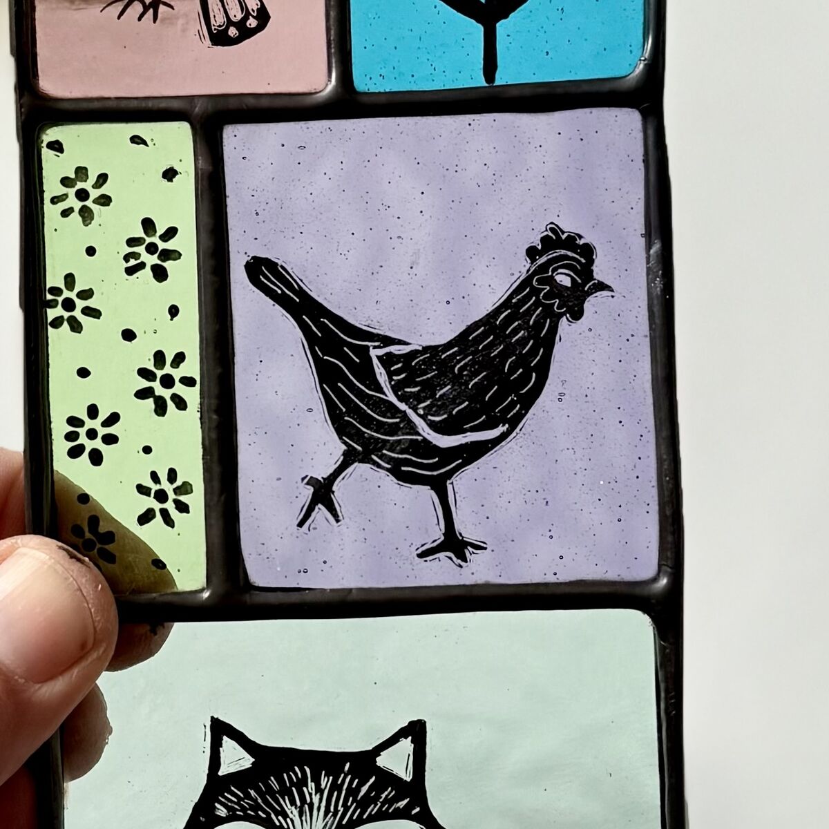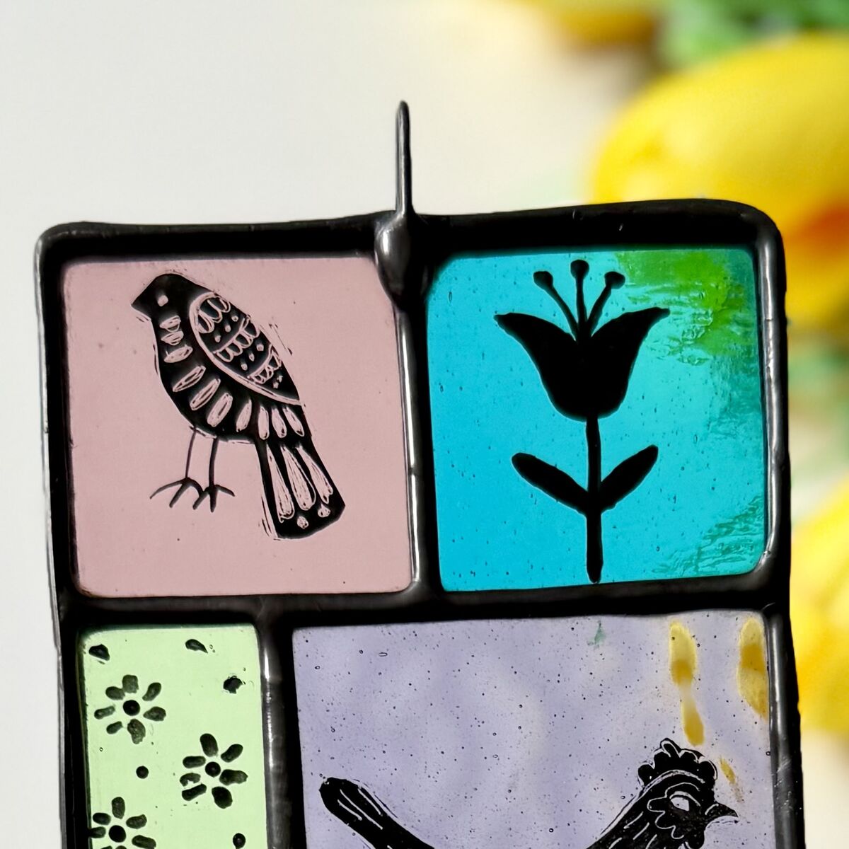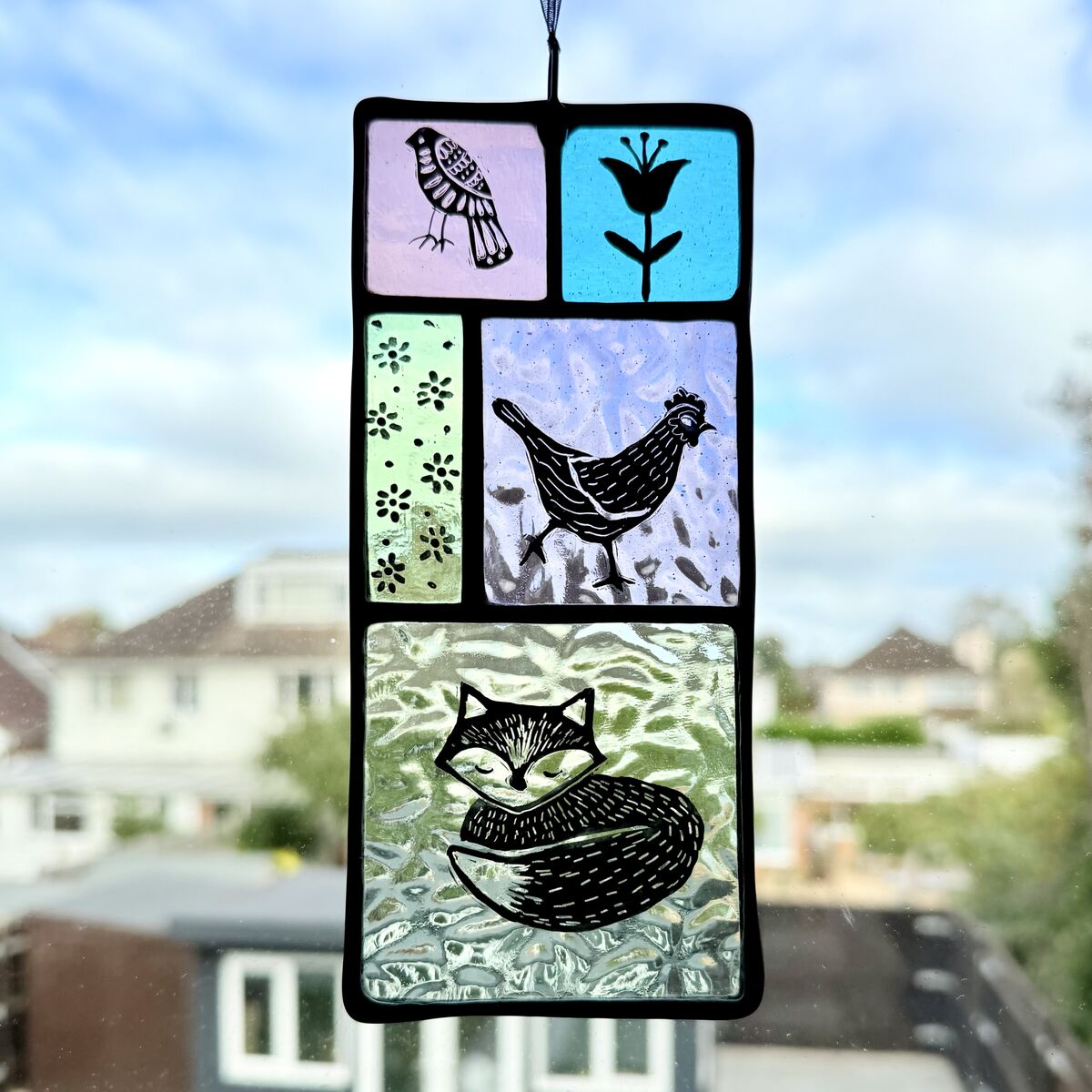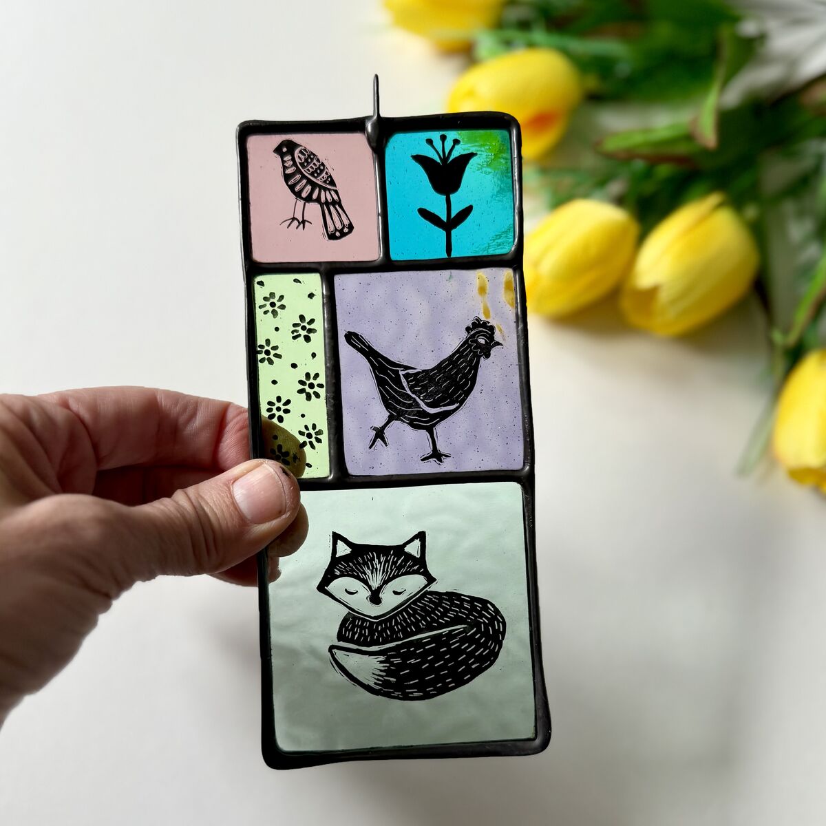 Brighten up your window with this hand painted hanging featuring a fox, a chicken and a folk style bird.