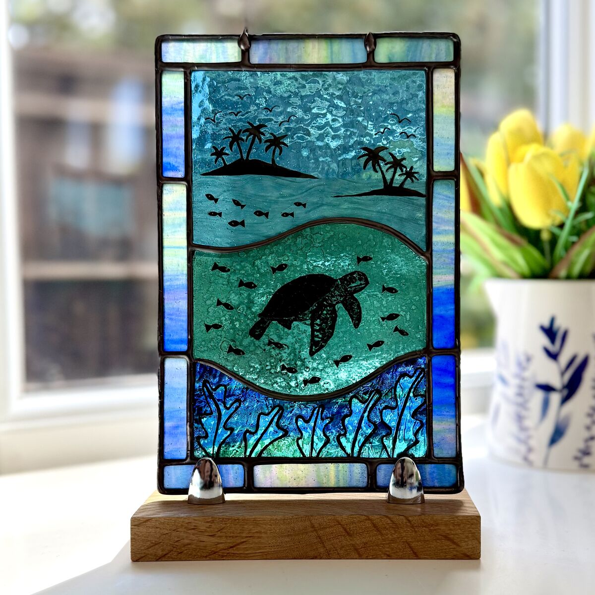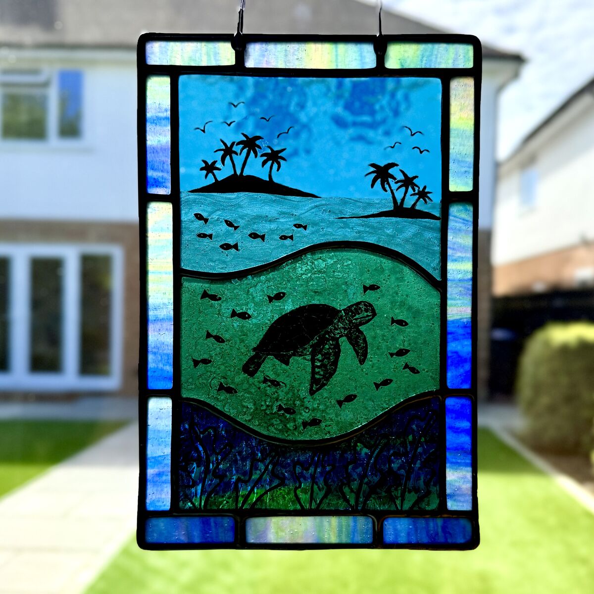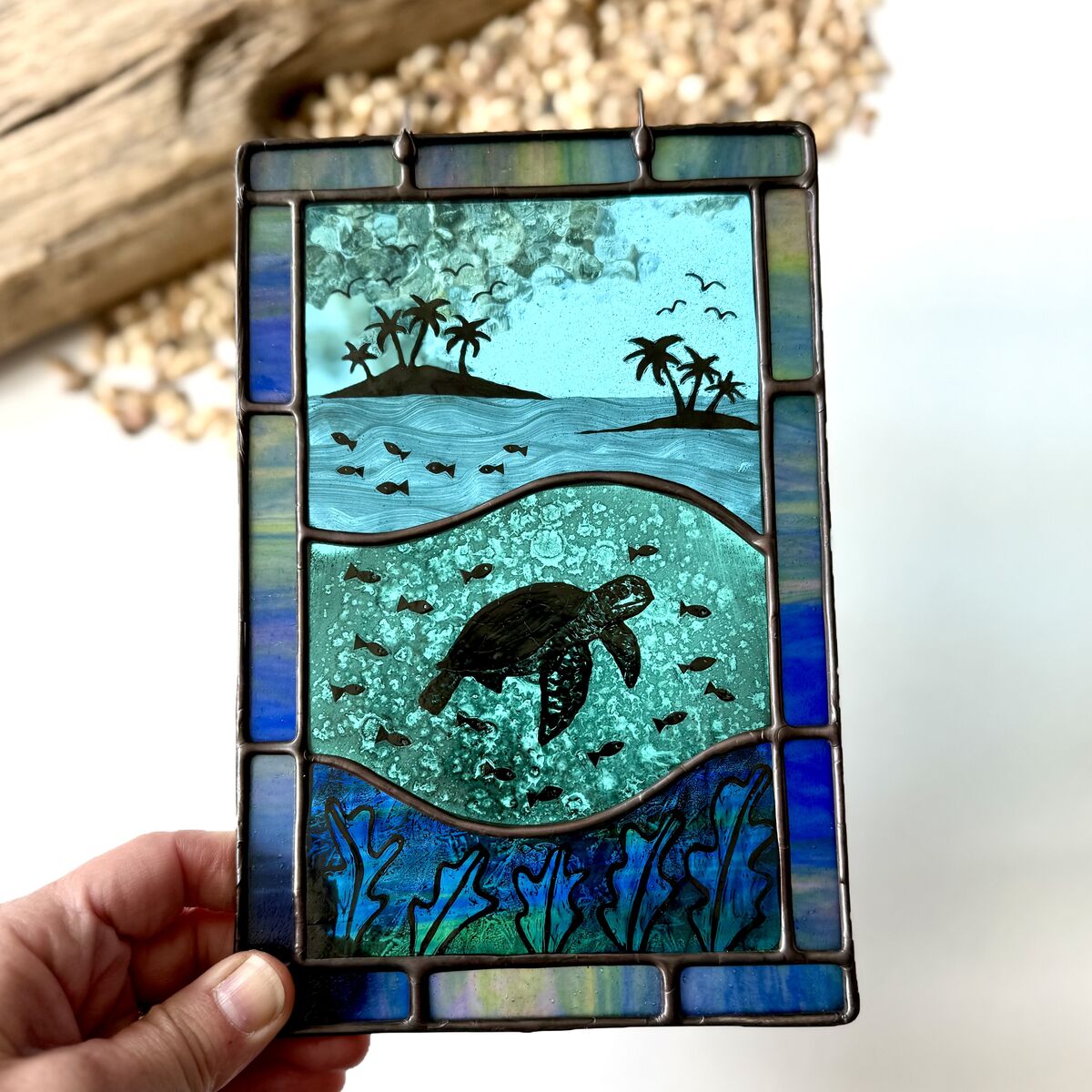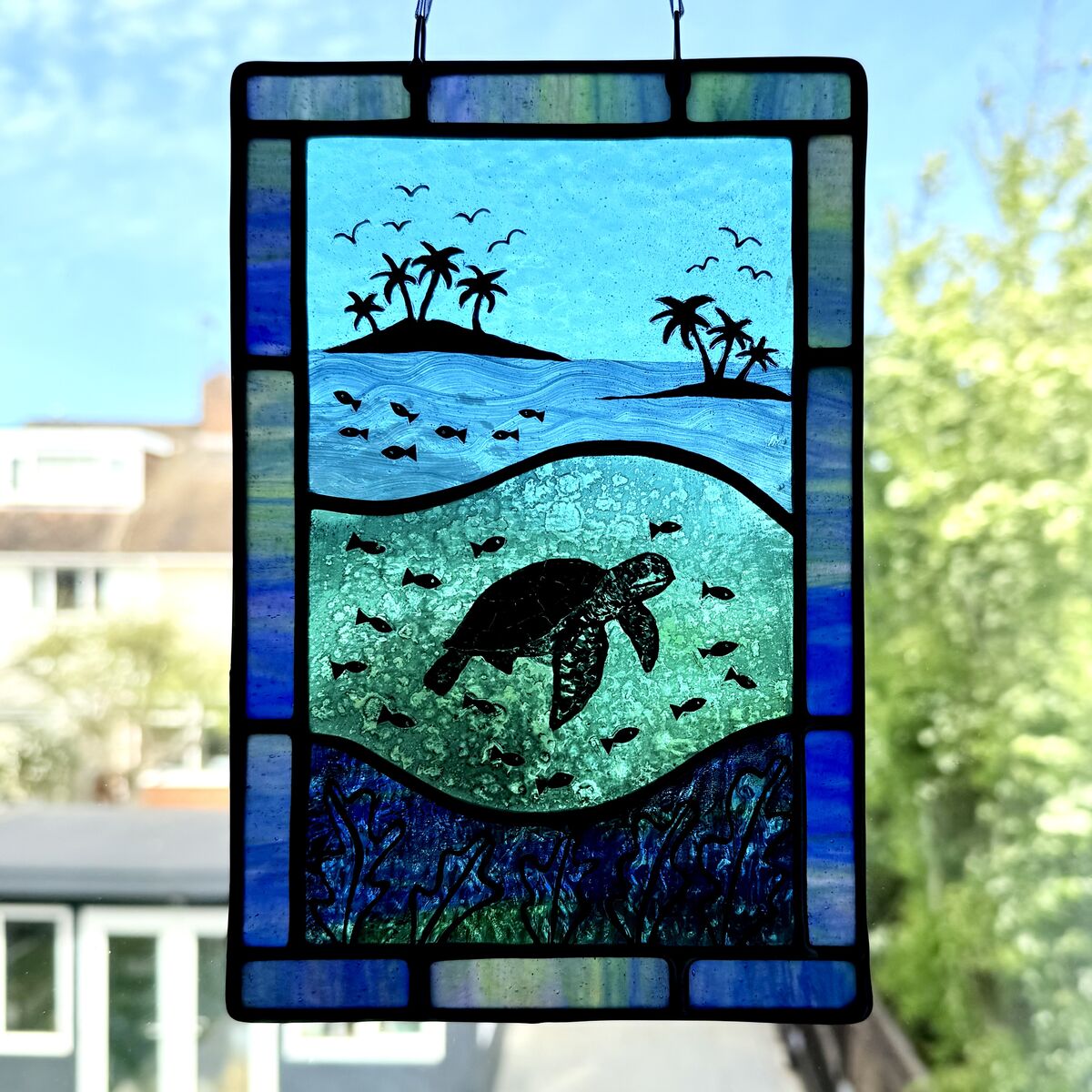 Brighten up your window with this hand painted ocean scene featuring a turtle and tropical islands.