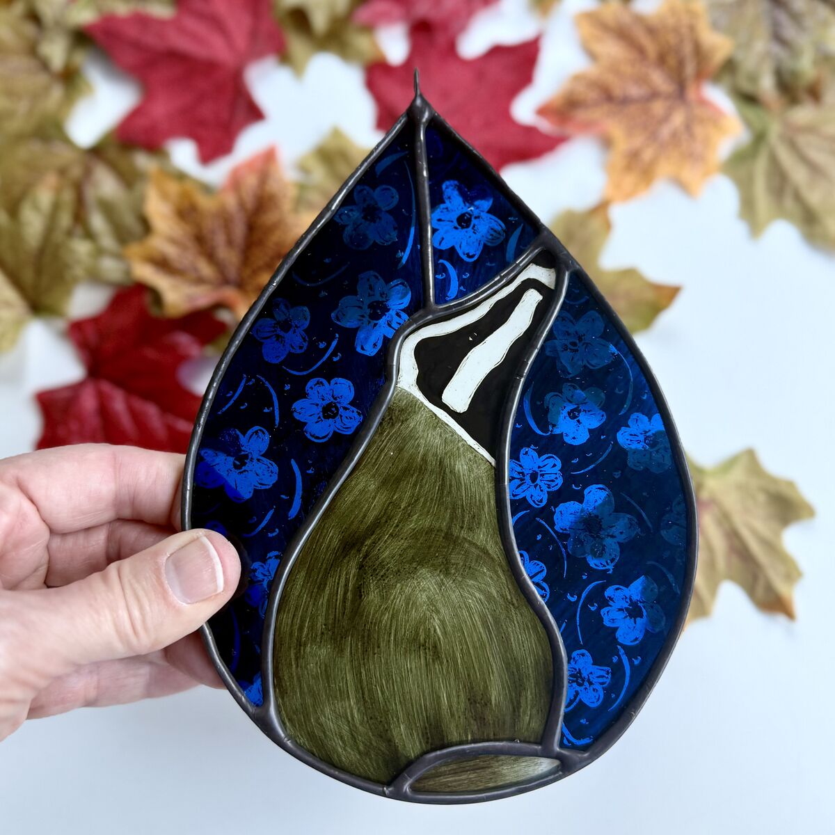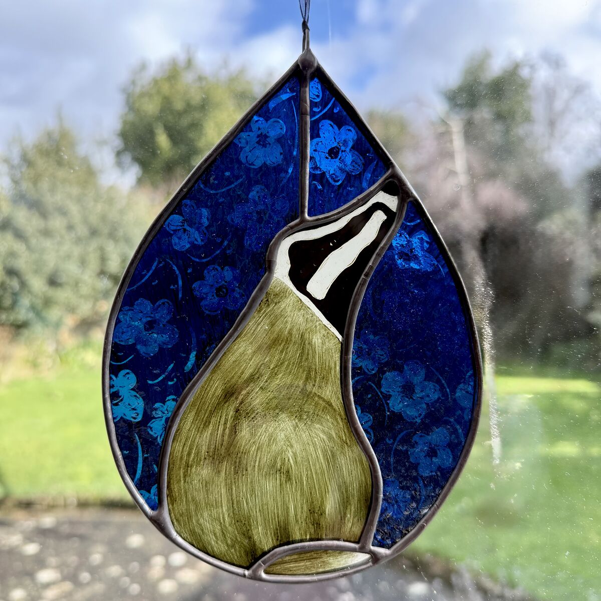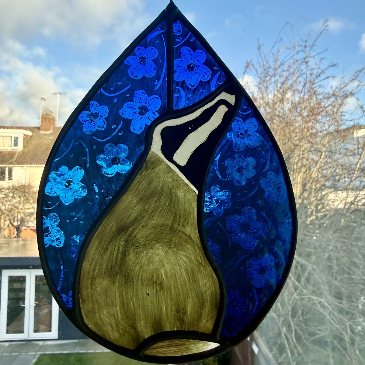 The badger and the surrounding glass have been painted using layers of enamel paint. Each layer is fired separately in order to permanently fix it in place.