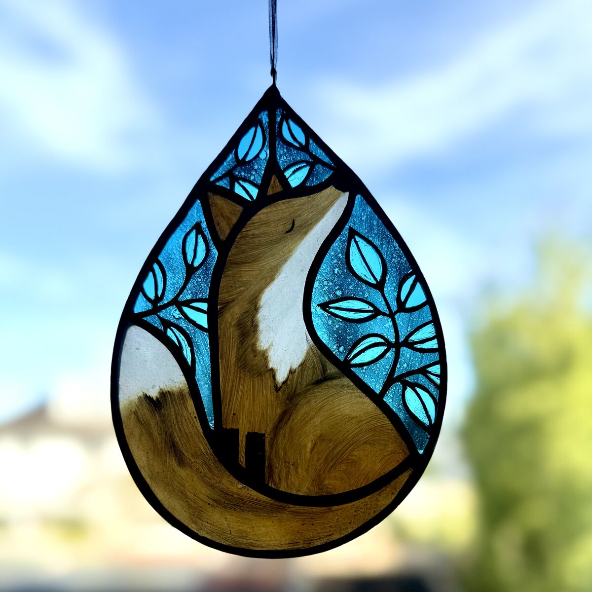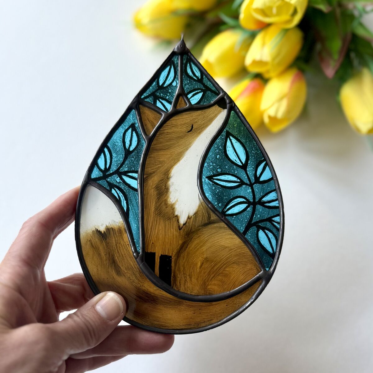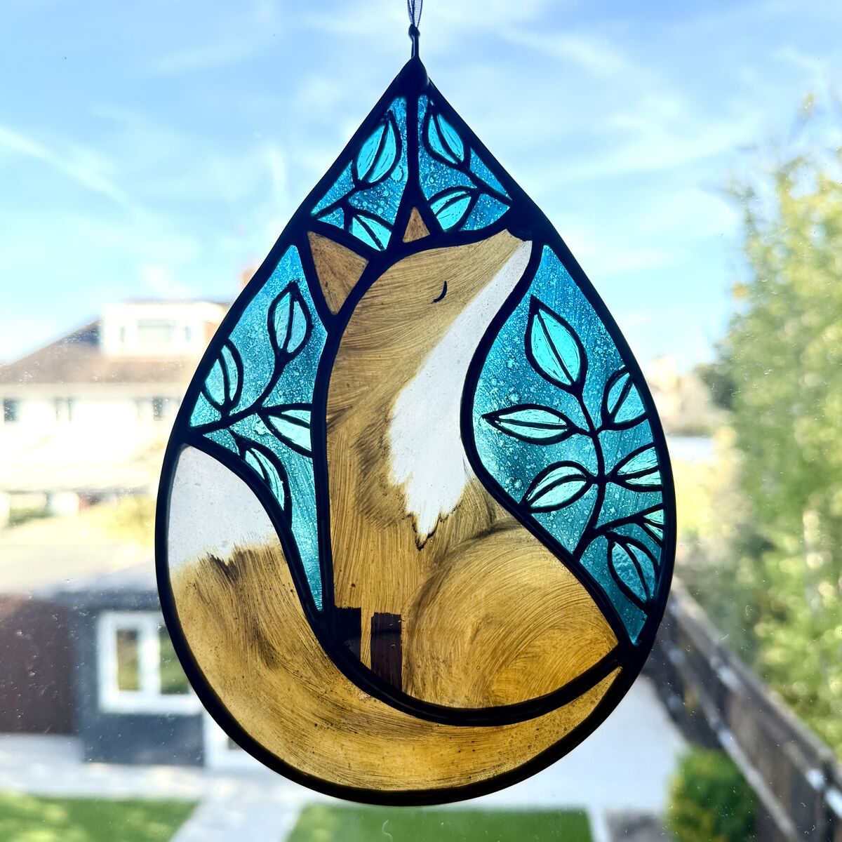 The fox and the surrounding glass have been painted using layers of enamel paint. Each layer is fired separately in order to permanently fix it in place.